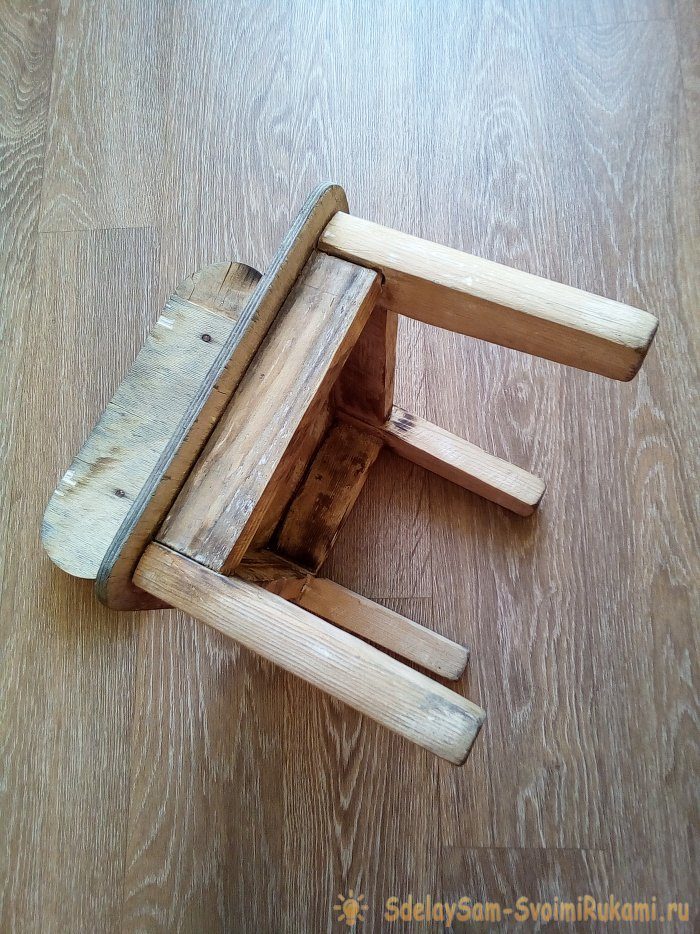 Если у вас завалялся старый деревянный стульчик небольших размеров, то его можно восстановить нехитрым способом и с применением всем доступных материалов. Наша история была такова: у нас на даче валялся сосланный детский стульчик. Лет ему уже почти сорок (такая древность!), но еще довольно крепкий.