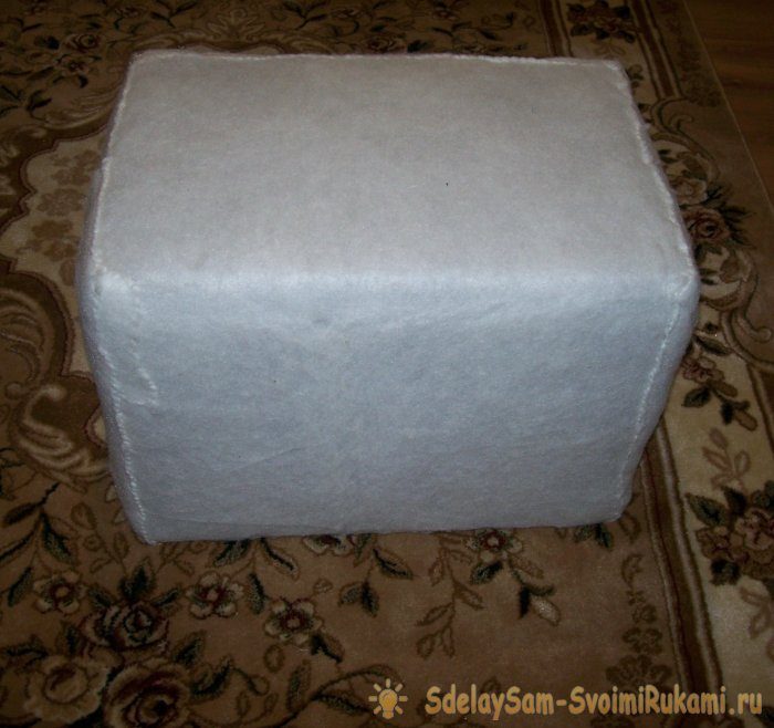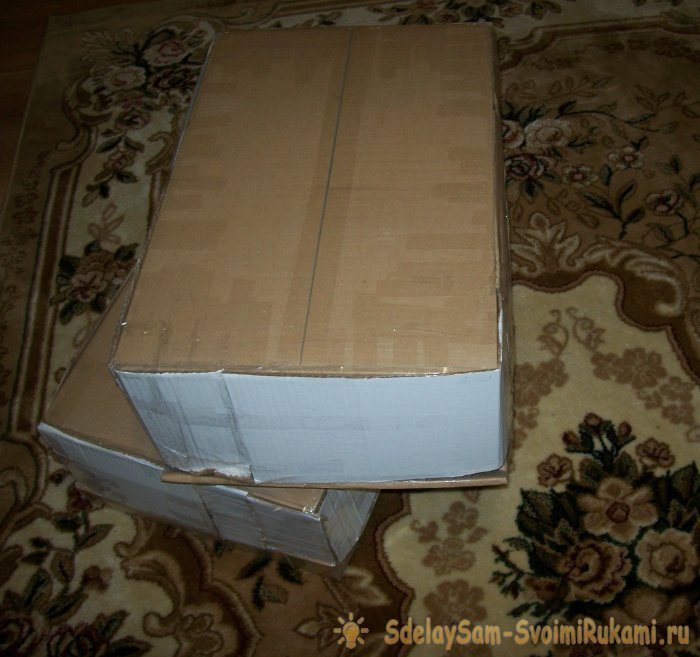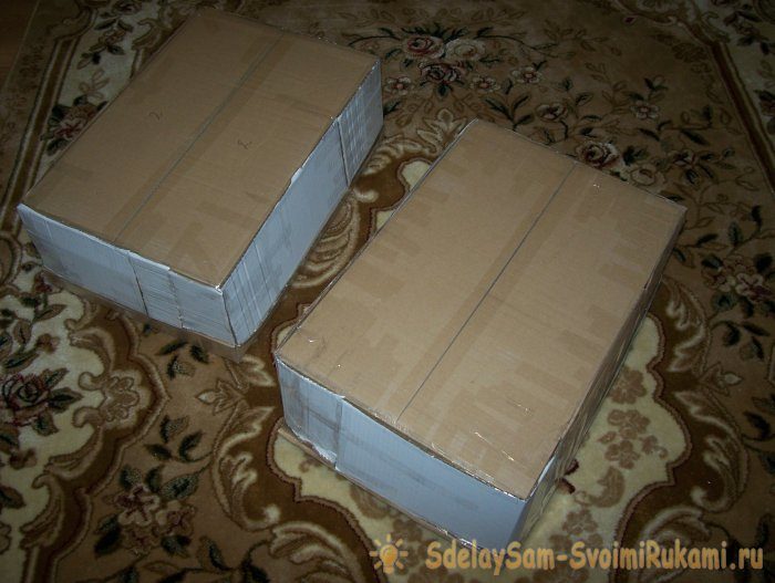 Можно сделать и сразу картонную основу, а не брать две коробки. Однако тогда получится очень большое изделие. Далее две коробки будут ставиться друг на друга.