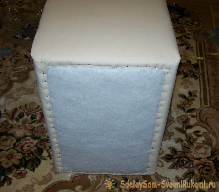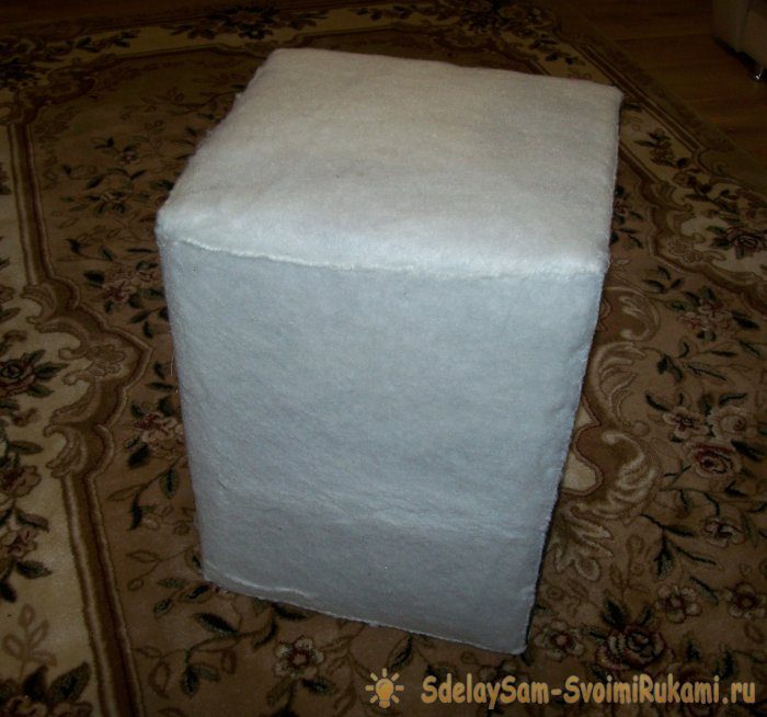 Затем берем синтепон и накладываем его на будущий пуфик. Синтепон придаст мягкости нашему изделию.