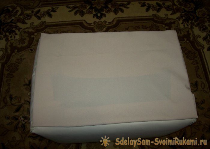 Теперь, когда подкладка уже готова, начинаем с помощью гвоздей или степлера прикреплять дермантин белого цвета. Делаем сначала выкройку дермантина, которая будет состоять из 2 частей. Боковых частей и верхнего прямоугольного листа. Только снизу оставляем место для нижней подкладки.