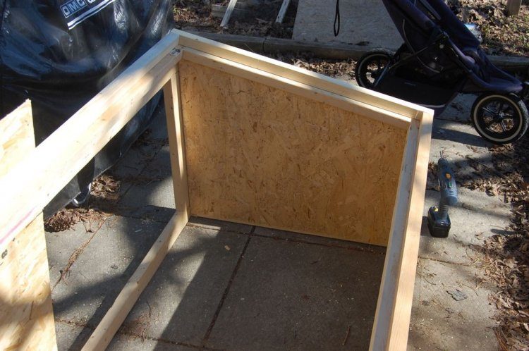 Теперь берем фанеру, выпиливаем по размерам сторон. Далее прикручиваем к стенкам. Фанера прикручивается к каркасу внутри короба, а не с наружи.