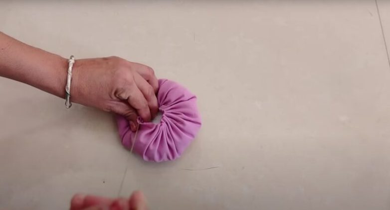 Из отреза ткани размером 23 см на 23 см вырежьте круглую заготовку. В центр положите наполнитель, края стяните. В итоге получится объемная верхняя часть сердцевины цветочка.