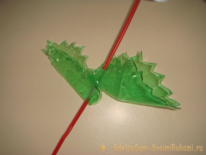 Для начала нужно подготовить проволоку, которая хорошо держит форму. Листья для цветов можно вырезать из зеленой пластиковой бутылки. Чтобы создать на листочках более фактурный край, надо слегка подогреть его над пламенем зажигалки.