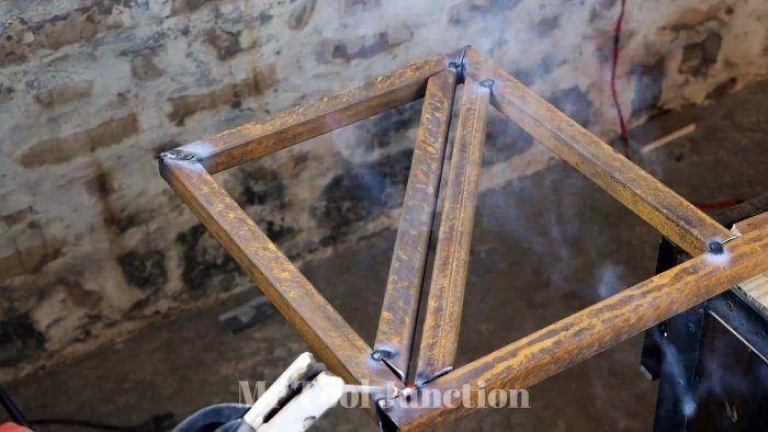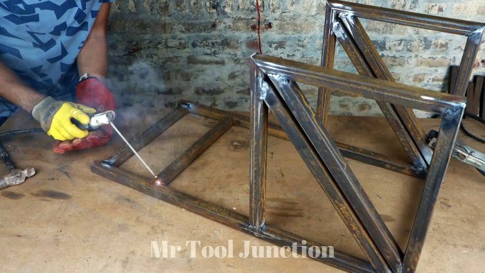 На ножки стула приваривается 2 перемычки из трубы. Их нужно будет разрезать между диагональными вставками, чтобы конструкция снова могла открываться. После этого каркас можно покрасить.