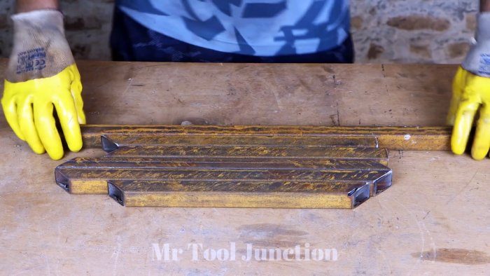 Каркас стула изготавливается из профильной трубы. Он может иметь любой удобный для вас размер. В данном случае высота ножек делается 32 см. Для каркаса нужно будет сварить две Р-образные детали, где длинная труба будет служить опорой спинки. Желательно, чтобы высота спинки была такой же, как и ножек, но не меньше. В таком случае последняя ступень лестницы получается горизонтальной во всех плоскостях.