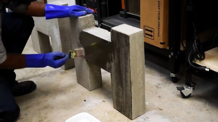 Для защиты бетонных ножек от влаги покрываем их кремнийорганической эмалью. Дав ей впитаться и высохнуть, красим бетон в черный или другой цвет.
