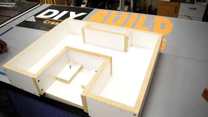 Начинаем работу с изготовления двух одинаковых опалубок под бетонные ножки. Для этого делим лист меламина переносной циркулярной пилой на две половинки.Затем каждую из них распускаем на стационарной циркулярной пиле на необходимые элементы по две единицы.