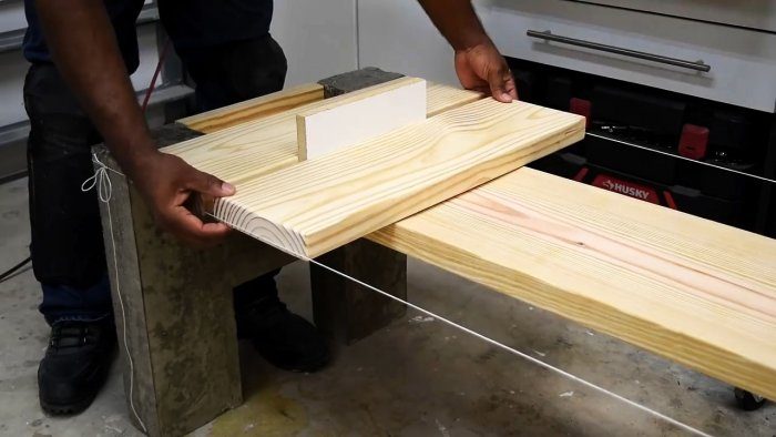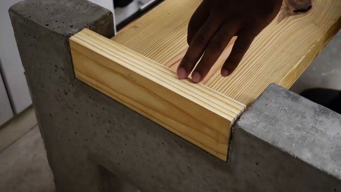 Снизу продольной доски для ее укрепления и устойчивости посередине приклеиваем и прикручиваем шурупами доску поуже, но такой же толщины, которая своими концами будет упираться в бетонные ножки.