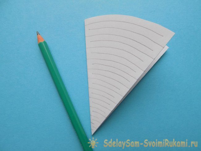 Рисуем на ней линии, располагая поочередно их то от одного, то от другого края заготовки. Расстояние между ними должно быть не более 5 мм. Чем чаще будут линии, тем выше в последующем получится елочка.