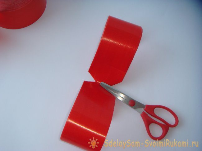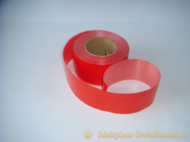 Возьмите декоративную пластиковую ленту шириной 5 см. Можно использовать как однотонную, так и с узором. Из более тонкой ленточки тоже получится очень даже симпатичный бант.