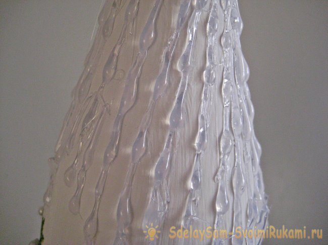 12. В верхней части бутылки (от горлышка к плечикам) выполняем ледяные капли. В данном случае используем горячий клей.