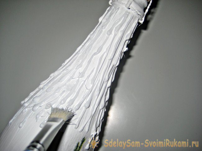 3. Приступаем к грунтовке бутылки. Для этого используем широкую кисть и белую акриловую краску. Наносим краску в один слой.
