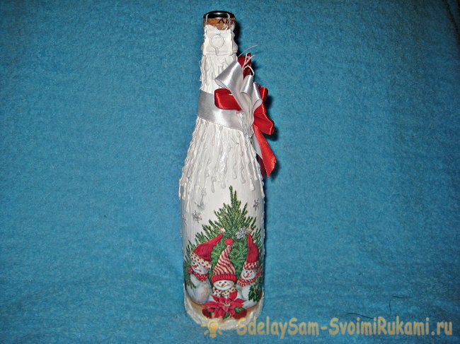 Хорошим подарком, да и просто декором праздничного стола, станет бутылка шампанского, украшенная в технике декупаж.