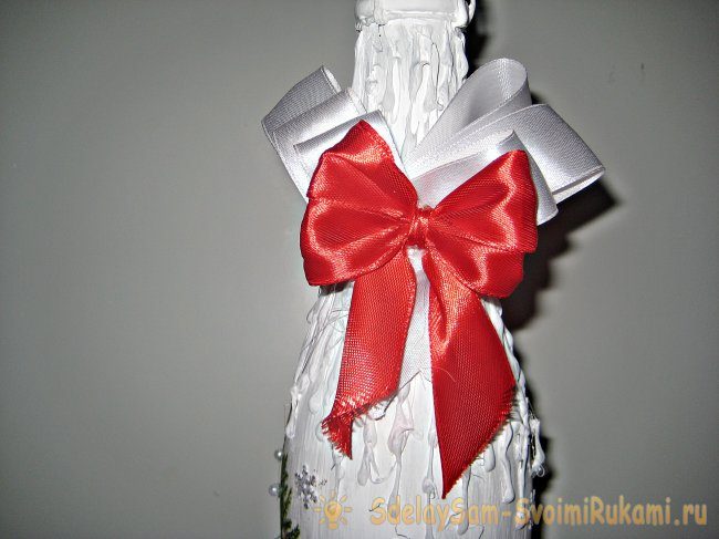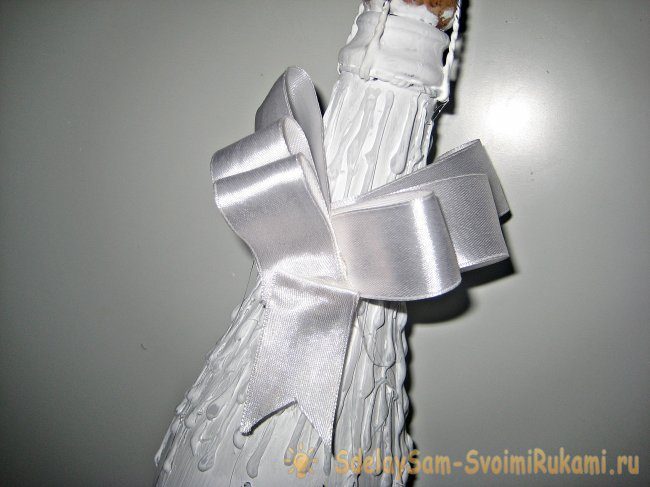17. Приступаем к декору горлышка. Берем широкую белую ленту и закрепляем ее на горлышке.