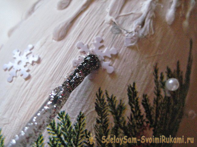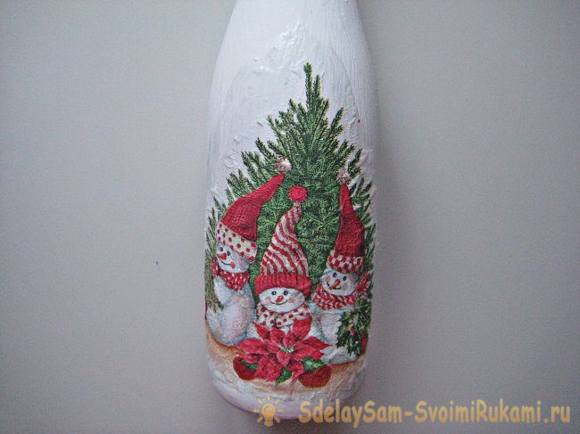 16. Затем снежинки окрашиваем блестящим лаком. После чего покрываем всю бутылку акриловым лаком.