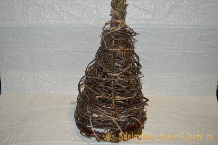 3. Каркас обматываем тонкими ветками. Чтобы прутья надежно держались, окручиваем изделие шпагатом.