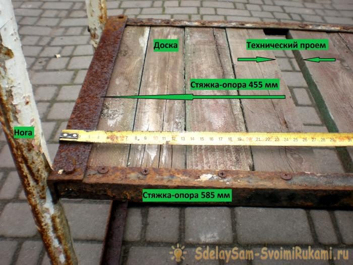 С обратной стороны стяжки-опоры на 585 мм просверлите отверстия для крепления доски.