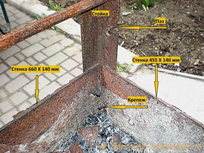 В двух нижних соединительных элементах для жаровни (35 X 35 X 660 мм), по краям с одной планки выпилите паз для состыковки уголков 35 X 35 X 455 мм вровень.