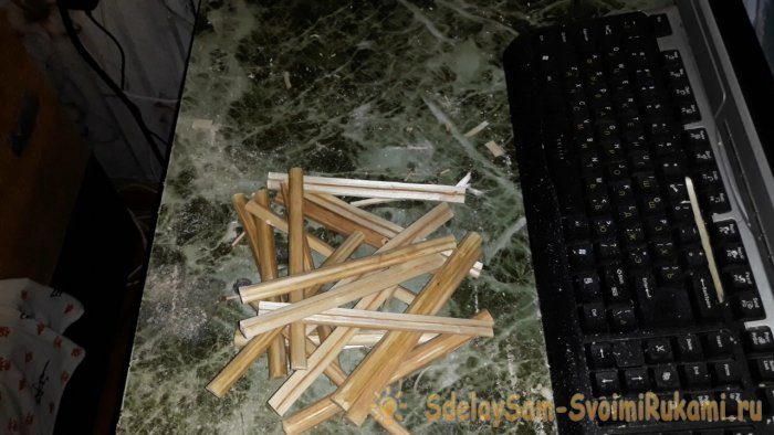 Поначалу я хотел так же крепить эти щепки к балке спичками, но потом решил, что здесь вполне хватит и горячего клея, ведь нагрузки на крышу не будет никакой. К тому же этот клей абсолютно не токсичен, и не навредит свинкам.