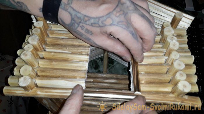 Фронтоны сделать оказалось ещё проще; здесь очень кстати пригодились обрезки брёвнышек, после основного строительства. Осталось просто секатором подогнать их под нужную длину, и усадить на горячий клей.