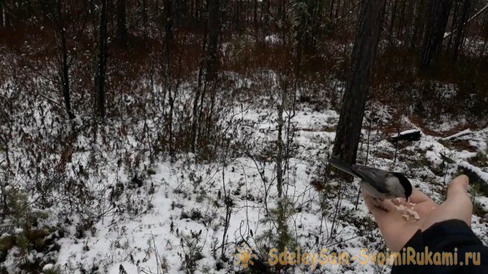 Теперь оно точно вместит в себя всё многочисленное свинское семейство. Из остатков более-менее длинных брёвнышек (чтобы не выбрасывать их зазря), можно сделать небольшую и простенькую кормушку для птиц. Я её собрал за 15 минут. Вам не затруднительно, а птицам, коим не сладко зимой – большая польза.