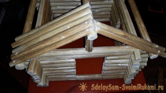 От высоты вертикальных опор, будет зависеть острота угла крыши. Всё это так же скрепляем спичками. Так же, по краям сруба, где будут заканчиваться скаты крыши, нужно прикрепить ещё по дополнительному бревну – на них ляжет нижняя часть скатов.