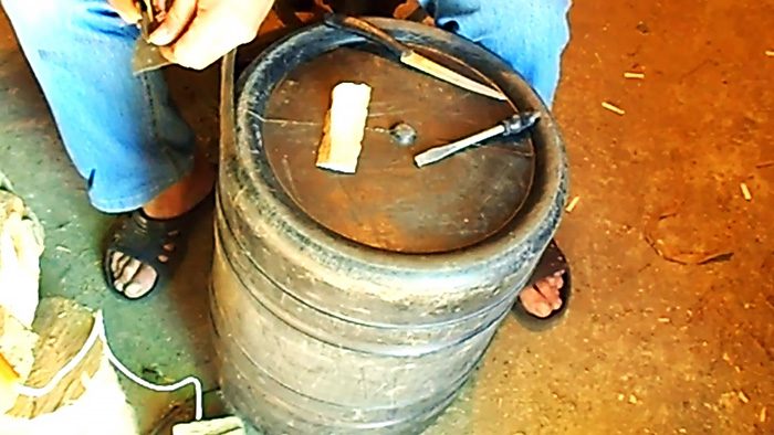 Далее берем газовую горелку и постепенно вплавляем сетку в тело бочки.