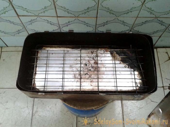 На дно насыпаем одну — две горсти опилок. Сверху кладем поддон, чтобы в него капал жир. Если этого не сделать, жир будет капать на тлеющие опилки, возгораться и продукт будет подпорчен неприятным запахом. Между поддоном и опилками должен быть небольшой зазор. Для этого можно с двух сторон на дне положить любые металлические предметы соответствующего размера. Сверху кладем металлическую решетку, от старого холодильника, например. На решетку кладем продукт, закрываем крышкой, ставим на газовый баллон с форсункой.