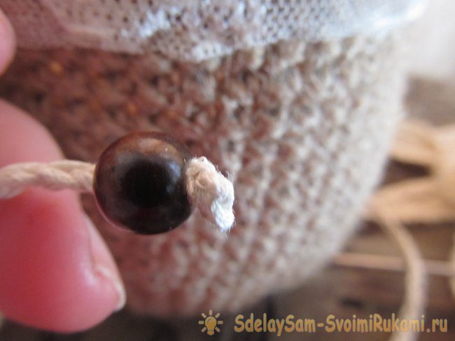 10. Из хлопкового шнура вяжем цепочку. Завязываем ее поверх места крепления тканевой вкладки. Пришиваем цепочку невидимыми швами.