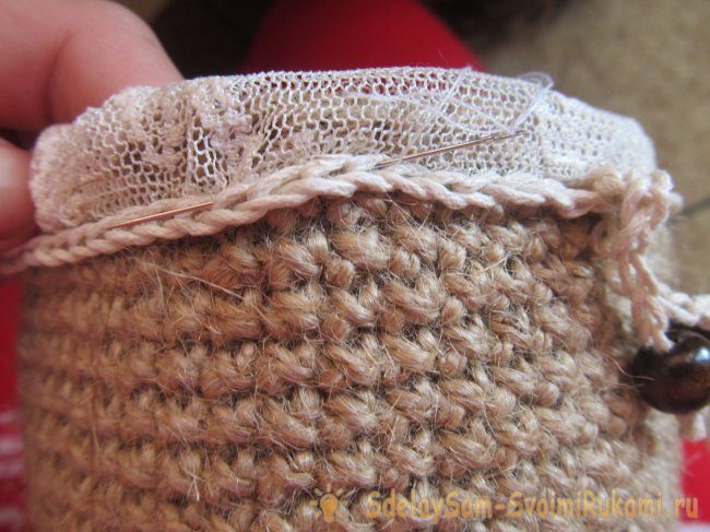 6. В шестом ряду и во всех следующие (примерно будет 22 ряда) вяжем по 52 столбика без накида. Закрепляем нить, когда джутовая корзинка связана, вставляем внутрь джута пластиковый стакан.
