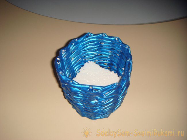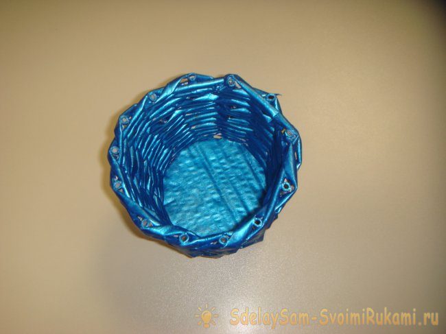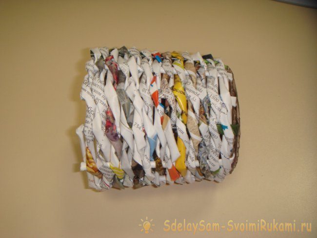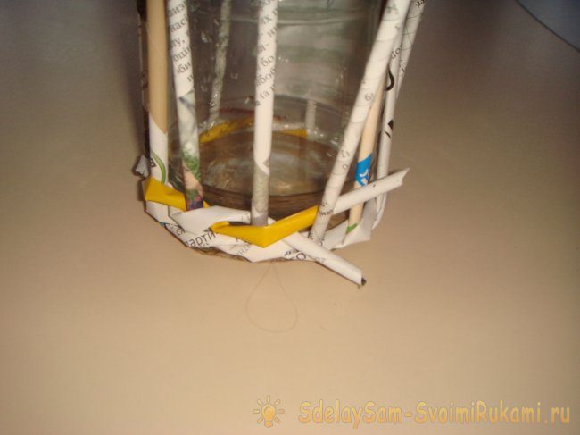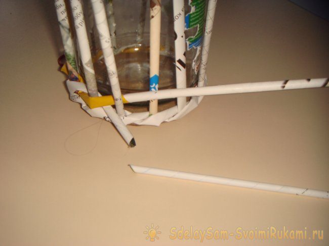 Когда вы доплетете до горлышка банки, можно заканчивать работу. Оставшиеся концы трубочки приклейте внутри.