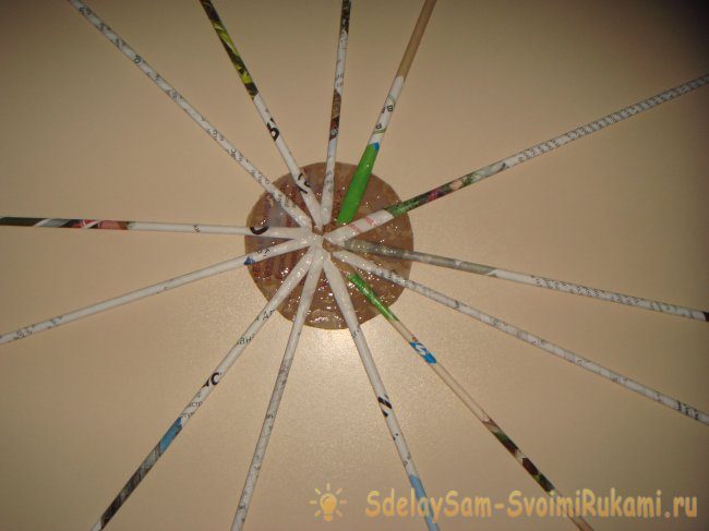 Утром работу можно продолжить. Возьмите полулитровую банку, поставьте ее на картонный кружок и загните вверх все бумажные трубочки. Баночка нужна для ровного аккуратного плетения.