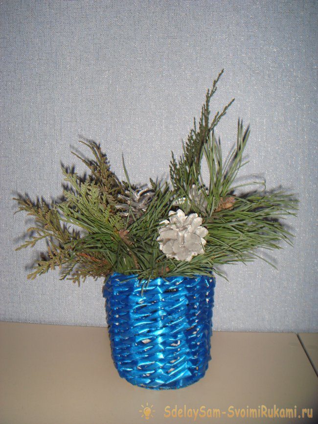 Природный материал можно менять по временам года, а вазочка останется та же. Выглядит поделка очень красиво!