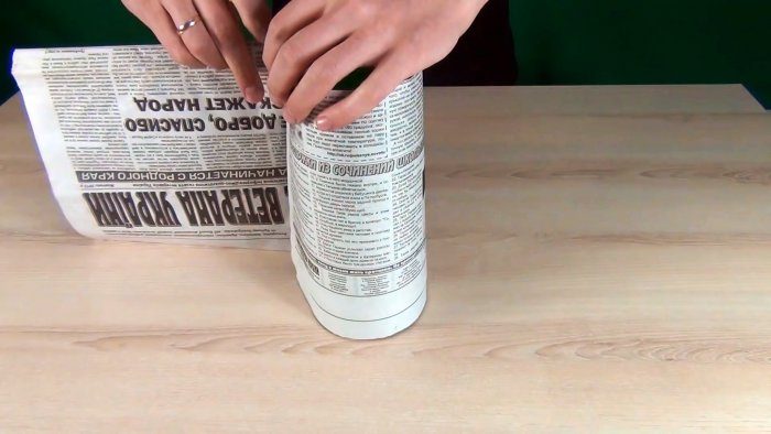 Далее необходимо затемнить бутылку. Для этого на нее наматывается газета или другая плотная бумага. Ее можно зафиксировать скотчем, подвязать ниткой или просто прижать канцелярской скрепкой.