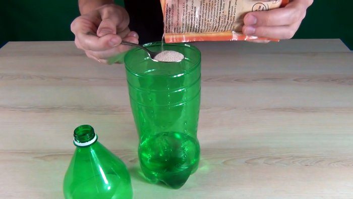 Затем в срезанную бутылку вставляется перевернутая горловина, расположенная как воронка. Она не должна достать до воды с дрожжами.