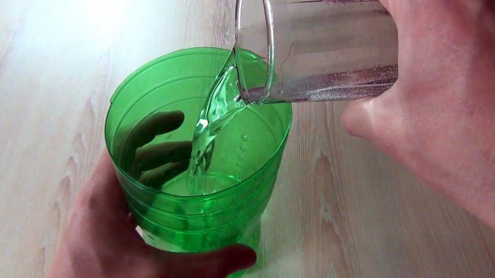 Затем нужно приготовить раствор для привлечения комаров. Для этого необходимо подогреть 200 мл воды до температуры +35...+40 градусов Цельсия. Она заливается в срезанную бутылку, и в ней растворяется 2 ст. ложки сахара.