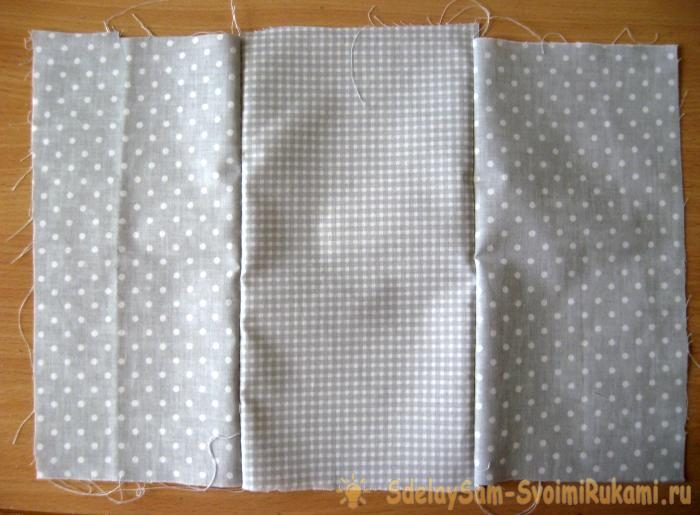 Сшиваем куски ткани между собой в единое полотно. Теперь данный кусок ткани кладем лицевой стороной вниз. Теперь кладем переплетную часть, намазываем края и уголки клеевым карандашом.