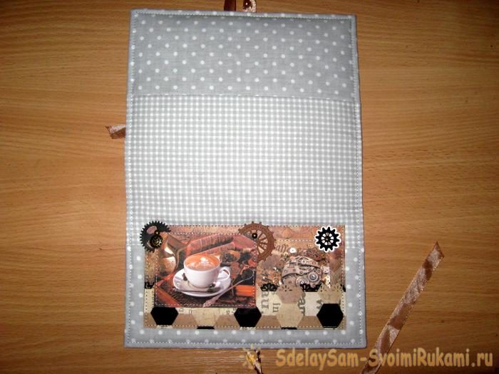 В боковые части вставляем переплетные прямоугольники изнутри, а снаружи клеим такие же заготовки из скрапбумаги. Прошиваем с лицевой части каждую сторону отдельно.