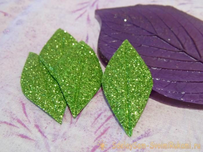 Переходим к зелёным листьям, их 4 заготовки. Нужно сделать прожилки. Можно по лицевой стороне нарисовать зубочисткой аккуратно. Также красиво будет и после обработки на оттиске листа из пластика. В этом случае располагаем заготовку из замши лицевой стороной на пластик, а сверху укладываем белый лист бумаги. Утюгом гладим по детали через бумагу. Отпечаток получается интересный.