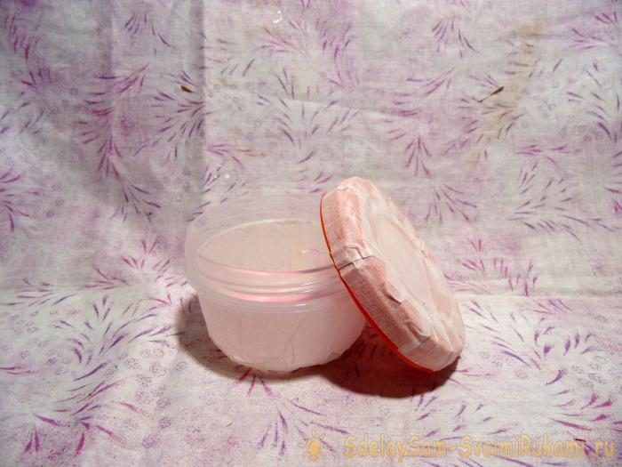 А на внешние стороны контейнера клеим розовую ткань. Вырезаем полоску по размеру данной банки, а высоту её делаем на 1 см больше имеющегося размера. Этот излишек немного разрезаем ножницами и прижимаем на дно шкатулки.