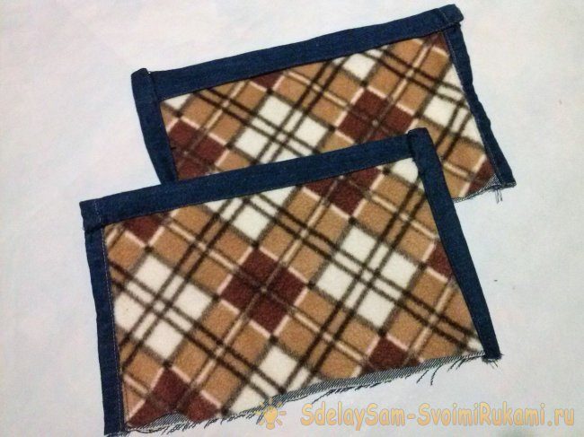 Вырежьте деталь №1 для каждого сапожка и из джинсовой ткани, и из флиса. Соедините их между собой и прошейте, утеплив таким образом будущее изделие.