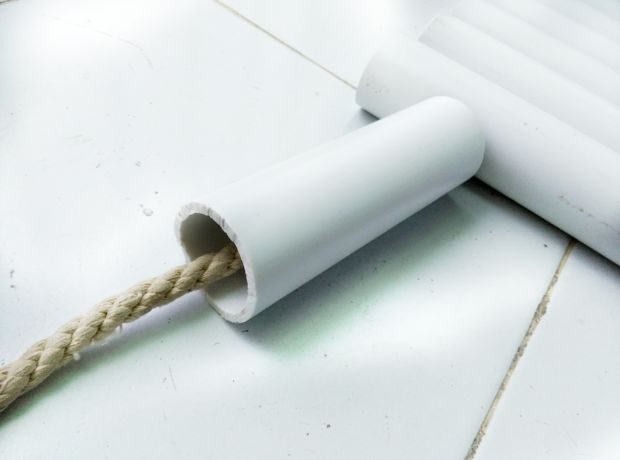 Для нанизывания на веревку в трубах нужно высверлить отверстия диаметром 12 мм. Но прежде чем делать это, нужно убедиться, что их диаметр будет соответствовать толщине веревки. Сначала нужно сделать метки в местах, где будете сверлить. Поставьте отметки ручкой на удалении 5 см от каждого края пластиковой трубы. Вам понадобится сверлильный станок. Так как у меня такого не оказалось, я обратился за помощью в мастерскую.