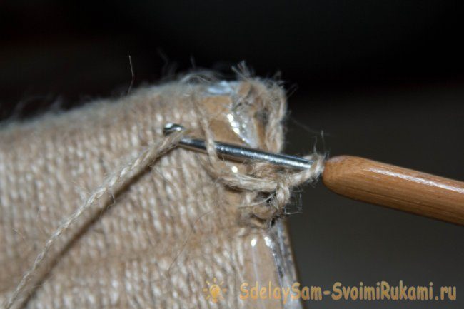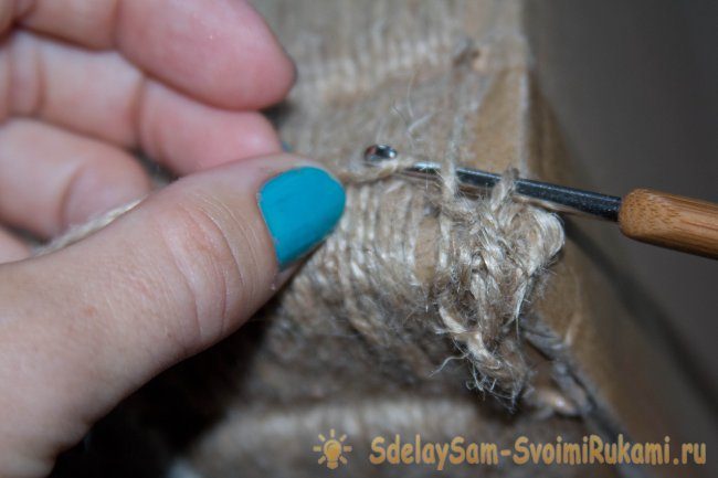 9. Проводим обвязывание нижнего края коробка для того, чтобы закрыть картонные куски, которые выглядывают снизу. Для этого просто вяжем петли в произвольном порядке, цепляемся петлями за нижний ряд джута. Такая хаотичная вязка только придает красоты изделию.