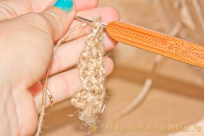 10. Для закрытия верхнего ряда вяжем полосу из джута. Она должна состоять из столбиков без накида. В одном ряду должно быть 4 столбика без накида. Можно делать и больше столбиков. Нам по толщине полоски должно будет хватить, чтобы аккуратно закрыть верхний край коробка. Длина полосы должна получиться такой, чтобы ее хватило закрыть бумажные полоски.