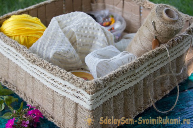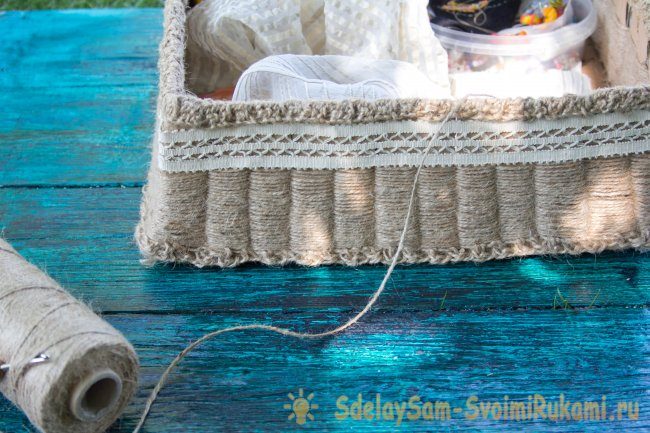 Даже из самых простейших вещей, на которые мы не обращаем внимание, считаем мусором, можно сделать что-то стоящее, непохожее ни на что другое. Если, например, соединить обыкновенную картонную коробку, которая уже собиралась в путешествие в мусорный бак, с джутовой веревкой и старым кружевом, то вполне может выйти симпатичный короб для рукоделия.