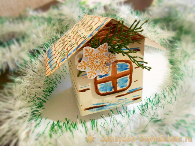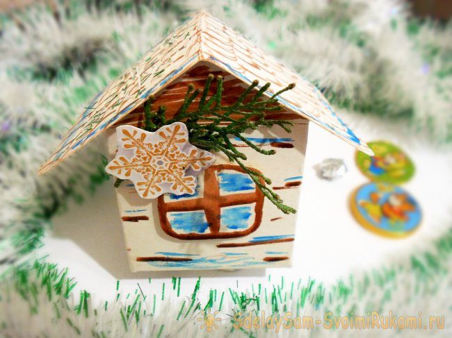 Весьма оригинально и интересно смотрится домик из тонкого картона. Его можно украсить самой разнообразной блестящей мишурой. А можно закрепить на фасаде крохотные веточки вечнозеленых деревьев.