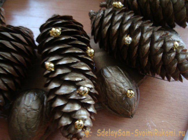 Шаг 3. Берем половинки скорлупы от грецких орехов, промазываем клеем и приклеиваем их между шишками. Мне понадобилось 13 штук. Старайтесь приклеивать аккуратно.