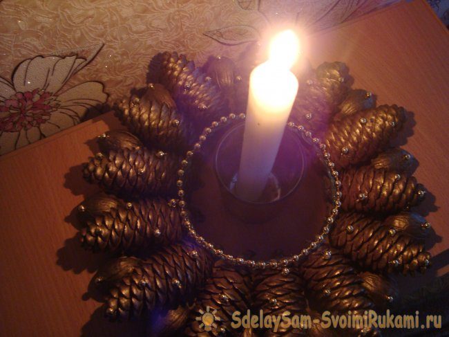 Шаг 2. На получившуюся основу подсвечника приклеиваем шишки при помощи клеевого пистолета. Мне понадобилось 13 штук, но может потребоваться больше или меньше в зависимости от размера шишек.
