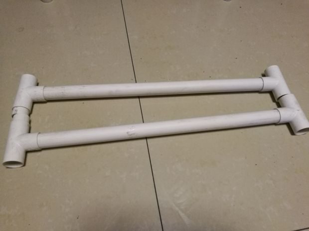 Берем 4 тройника и две длинные трубы. Длинные трубы с двух сторон должны входить в тройники. Соедините первый и второй уровни.