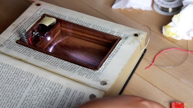 Устанавливаем подсветку. Клеим все детали на клей. Я использовал эпоксидную смолу для пружины. После того как вся схема отработана и функционирует – закрываем крышку коробки. Теперь закрываем книгу и смотрим выключается ли подсветка.